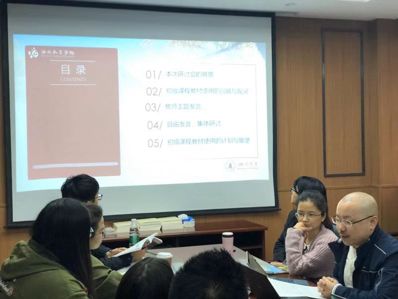 本次教研活动由初级汉语教研室主任胡翼主持并做了主旨发言,共有近20位担任初级汉语课程的教师参加。胡翼老师首先从国家、学校、学院三个层面阐述了本次研讨会的背景,接着回顾了学院近些年来各类课型使用的初级汉语教材,初级综合汉语主要采用北京语言大学出版社出版的《汉语教程》及配套的教材,包括了《汉语听力教程》和《汉语阅读教程》,口语课也使用《汉语教程》,以便配合综合课进行口语操练。写作入门课的老师选用《体验汉语写作教程》作为参考自编讲义,HSK初级讲座课选用了国家汉办出版的《标准教程HSK4(上)》,而初级视听课则是教师自编自选教学资料。然后,会议发言的教师们都围绕会议主题,对自己担任课程所使用的教材进行了介绍,发表了自己对教材使用的看法和意见,并提出了在教学过程中对教材内容的困惑。
