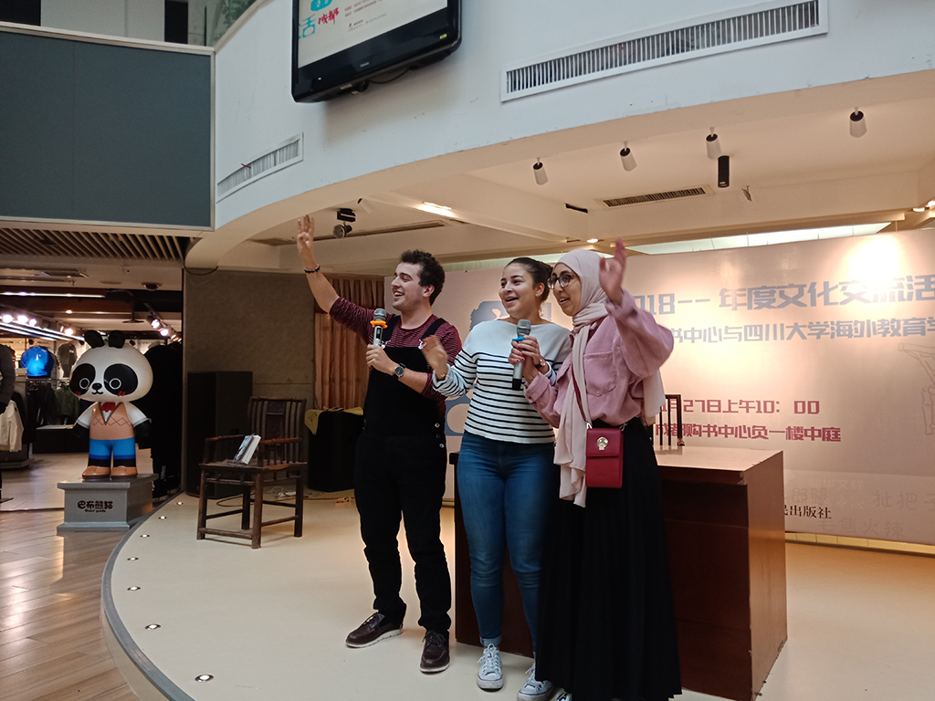 活动一开始,由购书中心的工作人员带来的一首《I believe I can fly》瞬间活跃了现场气氛,很多同学都随着歌声挥舞着双手或者跟着歌唱。一曲唱罢,成都方言词汇的现场教学便瞬间吸引了大家的注意。演员们用生动的肢体语言和有趣的方言向在座的来自世界各地的同学们展现成都话的精彩,不少同学第一次学会了“要得”“巴适”“造孽”等方言词。刚学会了些成都方言就进入到了“你说我猜”的小游戏,虽然同学们对于成都方言还不是那么熟悉,但这并不影响大家参与的积极性,在英语和普通话的帮助下,来自瑞士的Romain同学在同伴的配合下,成功猜对词语,获得奖励。热闹的互动之后,由川娃娃剧团可爱的小朋友们带来的成都方言情境剧深深地吸引了同学们,同学们纷纷拿起手机录像,不少同学还在小声重复着孩子们的台词,以这样的方式学习成都方言。