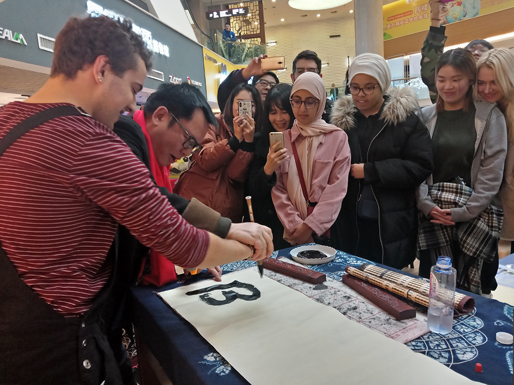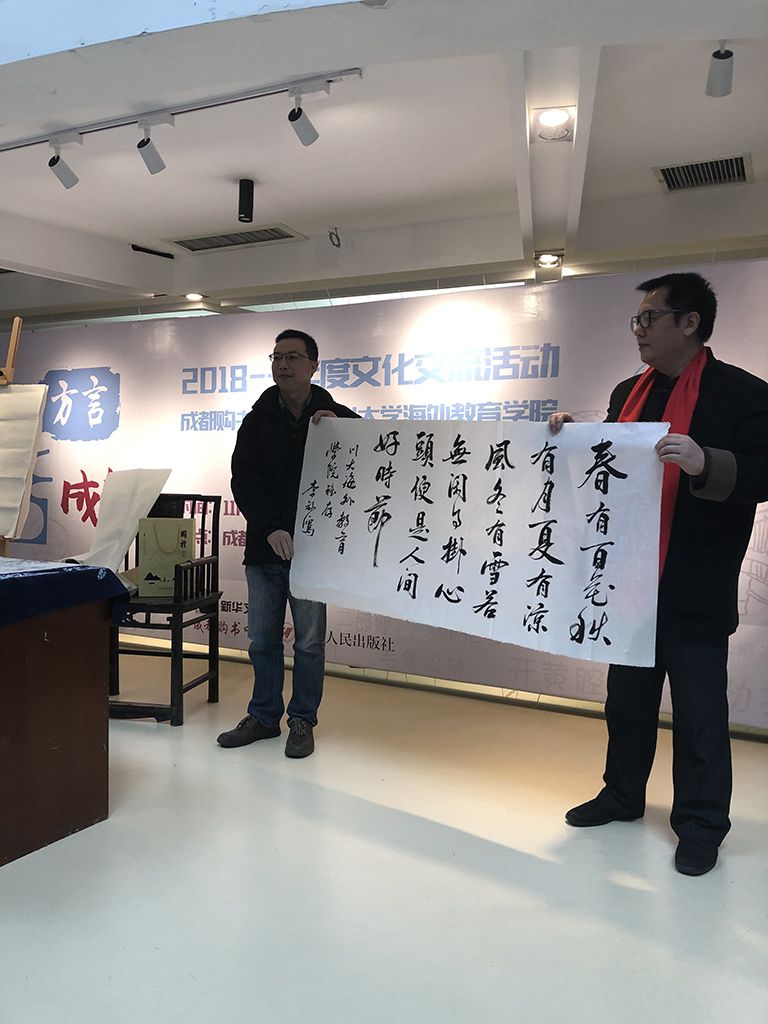 李先生最后现场书写长诗一首赠与海外教育学院。同学们感受了书法的神奇后,来自成都的大厨张亮为大家带来了川菜的魅力。他现场制作了传统川菜宫保鸡丁,制作过程中同学们都上台围观,制作完成后,同学们争先恐后地品尝,都赞不绝口。活动的最后,来自我们海外教育学院的同学为大家演唱了一首《对不起,我的中文不好》,欢快的歌声中本次活动圆满结束。