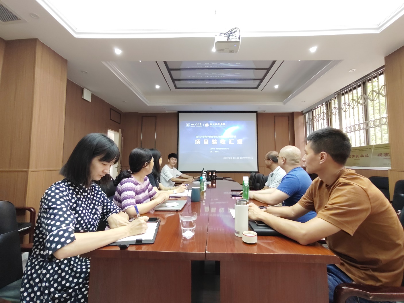 2022年7月5日上午,海外教育学院在二楼会议室召开了新开发的2138cc太阳集团官网系统项目验收汇报会。学院院长高伟、副院长雷莉、各科室负责人和教研室主任参加了汇报会,项目开发方成都明盾科技有限公司的负责人陈俊光进行了验收汇报。