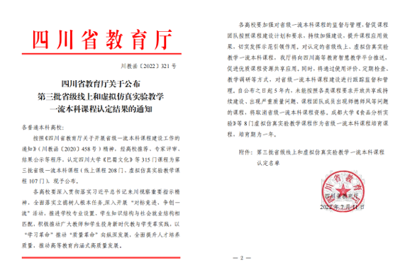 近日,四川省教育厅印发《四川省教育厅关于公布第三批省级线上和虚拟仿真实验教学一流本科课程认定结果的通知》(川教函〔2022〕321号)。经高校推荐、专家评审、结果公示等程序,认定315门课程为第三批省级一流本科课程(线上课程208门、虚拟仿真实验教学课程107门)。