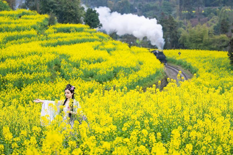 伊朗学生王维娜在花海中伴随着缓缓驶来的小火车翩翩起舞