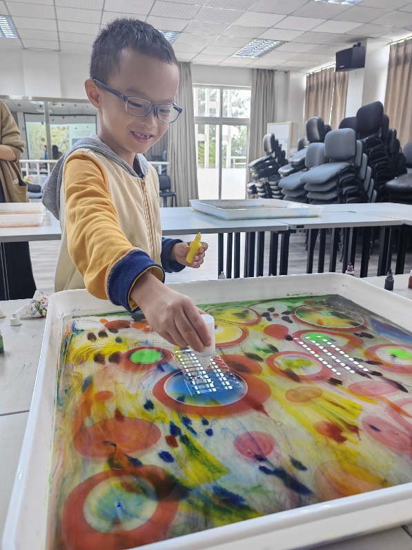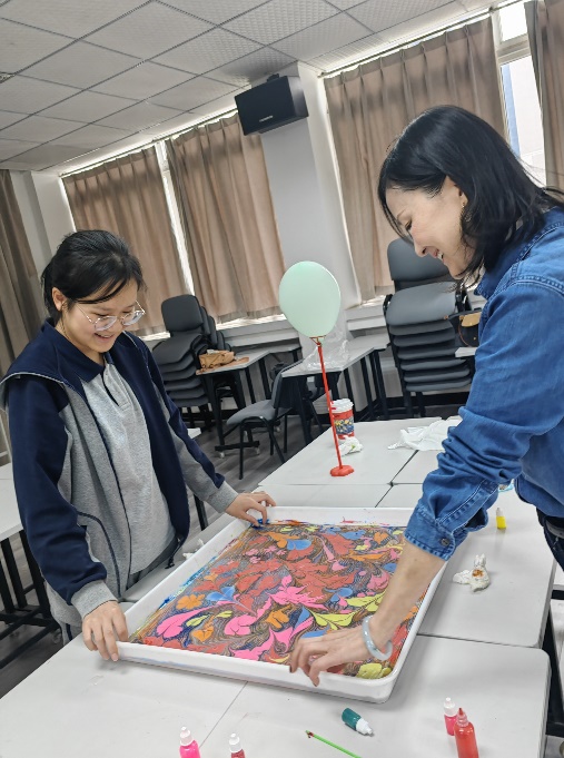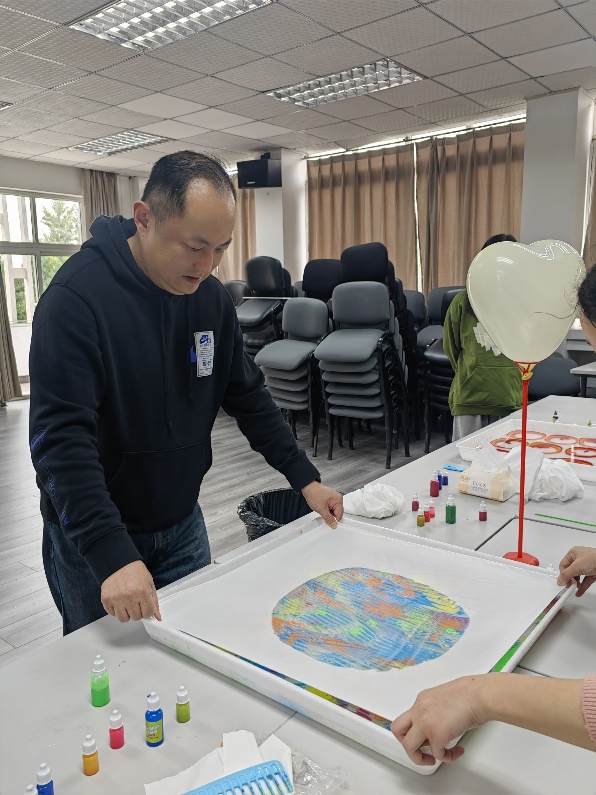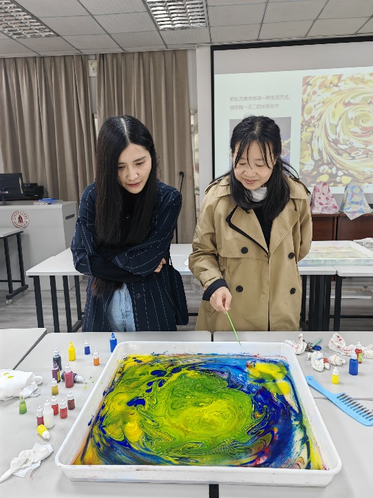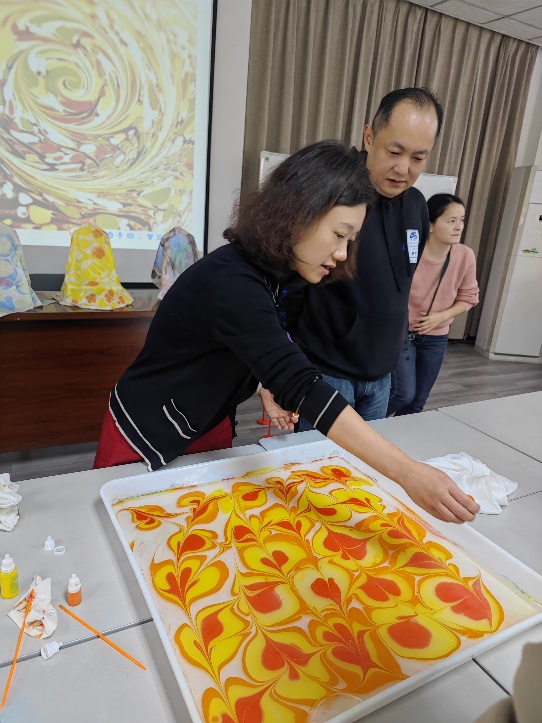 在活动进行中,教师们充分发挥想象力和创造力,有的大胆撞色,用大面积色块碰撞绘制丝巾;有的细心雕琢,精心把控制作过程的每一道工序;有的注重品质,借鉴与参考经典艺术作品,设计了独属海外教育学院的“星月夜”。