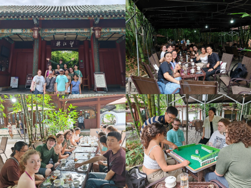 本次国际课程周,为增强本科生中华优秀传统文化传播、本科特色人才培养,校教务处与海外教育学院完成了首次合作。教务处通过选拔基础学科拔尖学生担任志愿者,深度参与海外教育学院国际课程周留学生不同语言文化主题的操练,同时加深学科交流。上周五基础学科拔尖学生志愿者们随海外教育学院的移动课堂同美国同学一起走进望江公园,了解公园闻名遐迩的历史。走进公园后,同学们相互交流这种大量生长于四川的独特植物-竹,感受它的外貌和代表的精神特质,参观公园内竹制作的艺术作品,漫步竹林,体悟中国文化符号的意境。然后,他们来到公园的茶馆,坐在竹林里跟普通市民一样喝茶嗑瓜子,在川大同伴的指导下学习如何打麻将。