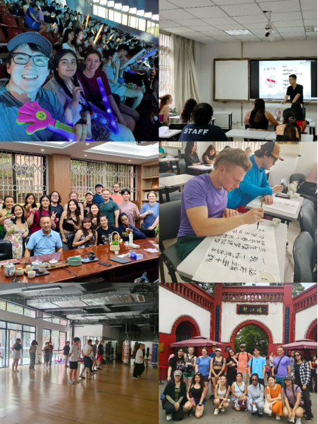 国际课程周期间海外教育学院的沉浸式学习项目,吸引了来自我校美国孔院合作高校的11名学生参加。同学们均为首次来华。两周的学习内容包括综合汉语、口语实践、巴蜀三国历史、中国少数民族艺术、中国茶文化讲座等,还有深受欢迎的太极和书法体验课。文化探访从成都市区的宽窄巷子、武侯祠,到熊猫基地、广汉三星堆,再到都江堰水利工程、青城山等,丰富紧凑的内容让同学们应接不暇。不少同学仔细收集了素材,希望在下周末的结业课上展示制作的短视频,分享他们难忘美好的经历。