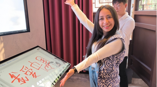 图6.乌兹别克斯坦学生美丽在春秋祠电子屏上留言“我爱中国”