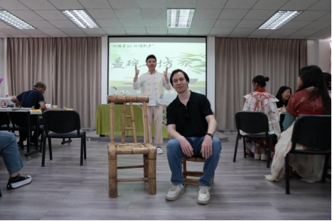 投票环节后,“盖碗工坊(鹤鸣茶馆)” 热闹开场。在茶艺老师的耐心讲解以及李志强老师和留学生同学的合作示范下,大家纷纷拿起盖碗,学习“左手托、右手开、三指握” 的冲泡动作,并尝试用四川方言点茶 “老板,一杯素毛峰”。现场还详细讲解了留茶、蓄水、不留茶等茶馆暗号,让参与者沉浸式体验四川市井茶文化的独特魅力。欢笑声与茶香交织,现场氛围达到顶点。