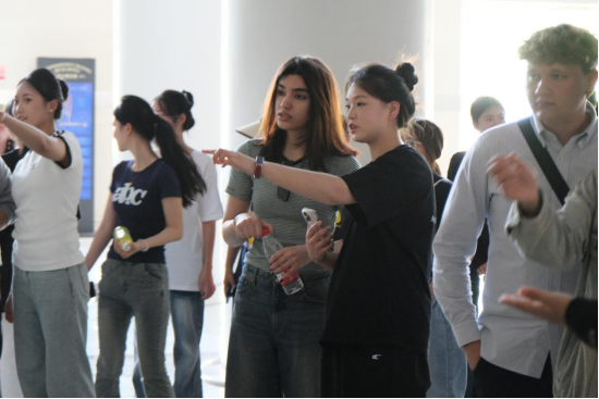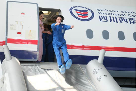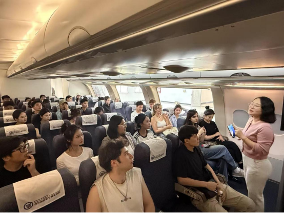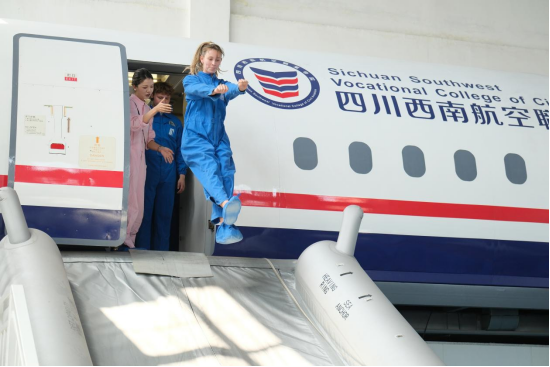 在客舱应急撤离体验环节,留学生们展现出浓厚兴趣,认真观摩指导教师的专业示范。随后,他们与中方学生搭档,踊跃参与仿真环境中的紧急情况处置任务。尽管部分同学起初对高空模拟场景感到紧张,但在同伴的鼓励和指导下,最终成功完成挑战。这一环节不仅将语言学习与实践应用紧密结合,更生动诠释了“做中学、学中悟”的教学理念。