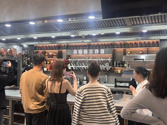 走出成果展示教室,工作人员就引导大家行至B区3楼西餐教学厅,介绍了学校的各位烘焙大师,然后带领大家参观了大师们的烘焙室。烘焙大师们构建了川菜的创新理论,依据传统中式神话人物设计了栩栩如生的翻糖蛋糕,让川菜在传承中不断焕发生机。西点教学区异构麦芽酮糖醇的创新应用更是成为了大家讨论的焦点。同学们惊叹于中华文化的饮食美学,也对兰明路工作室外“五味调和、天人相应”的烹饪生态观有了更深的理解与思考。