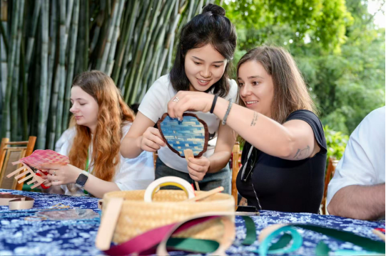 图5.波兰学生贝莉娴(左)和意大利学生如意(右)在眉山市青神县学习编竹扇