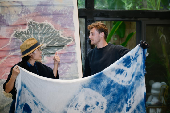 图7.比利时学生贝勒福(右)在德阳市高槐村展示其扎染作品