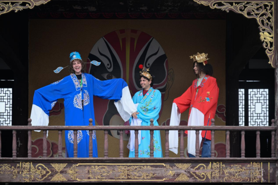 图8.留学生们在德阳市旌阳区体验川剧表演
