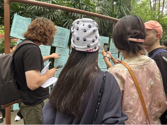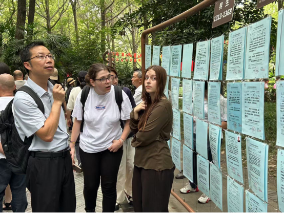 随后,队伍移步至人民公园著名的“相亲角”。粉蓝两色的征婚信息卡整齐悬挂,形成一道独特的社会图景。同学们好奇地浏览信息,时不时互相交流,讨论具体的相亲条件。并且,各小组随机对周围的人群进行访谈,深入了解年轻人或者老年人对相亲文化的看法和观点。在这一充满烟火气的场景中,同学们不仅提升了语言沟通能力,也深入了解了成都人对爱情的追求和对幸福生活的向往。