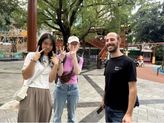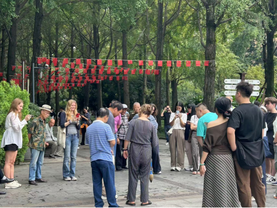 最后,同学们来到辛亥秋保路死事纪念碑广场集合。在集合时,不少同学被市民用水笔在地上写字的场景吸引,纷纷驻足观看并积极参与,与周围市民展开轻松自然的交流,氛围融洽。集合后,邓老师组织大家进行交流分享,同学们踊跃发言,积极分享。不仅讲述了自己与当地市民交流的真实体验,更是表达了对人民公园的深刻喜爱。通过这次活动,留学生们不仅走入了真实的成都“巴适”生活,更触摸到这座城市温暖包容的文化温度。2138CC太阳集团将继续推动语言学习与在地文化体验的深度融合,助力留学生在实践中学习,在交流中成长。