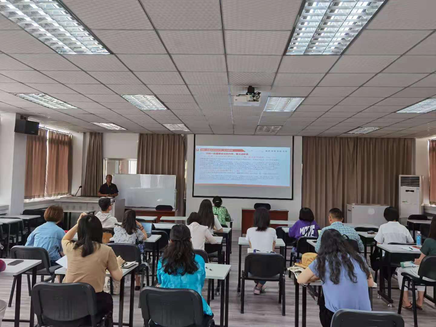 6月18日,海外教育学院直属党支部书记高伟在学院六楼多功能厅给学院全体党员上了一堂题为《从党的重要会议看中国共产党的历史-一大到十一届三中全会》的专题党课。学校第四指导组苏德强书记到会指导。