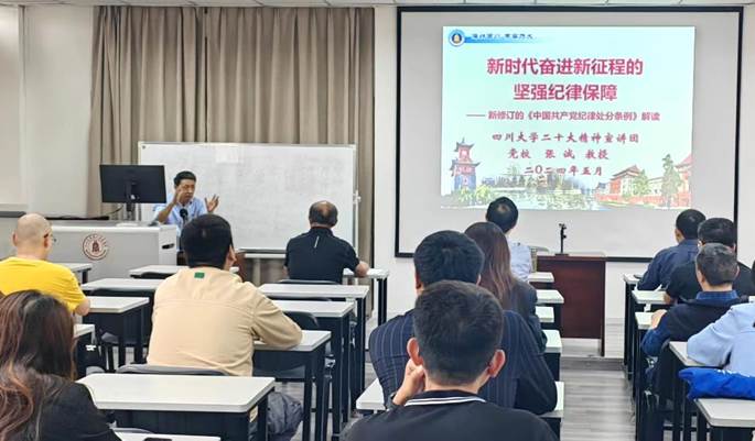 张诚教授以《新时代奋进新征程的坚强纪律保障》为题,从新修订《中国共产党纪律处分条例》的重大意义、新《条例》的主要特点与主旨要义、主要内容的解读以及学习贯彻的建议等四方面,紧密联系校内外严格执纪的若干警示案例,对《条例》的学习作了系统全面的宣讲。他最后强调,我们一定要扎实抓学习,全面深入领会掌握新《条例》;抓教育,不断增强遵规守纪的自觉性;抓落实,敢于严格精准执纪执法;抓结合,围绕中心服务大局;总之,以实际工作和高质量发展的成果来检验纪律学习教育的实际成效。