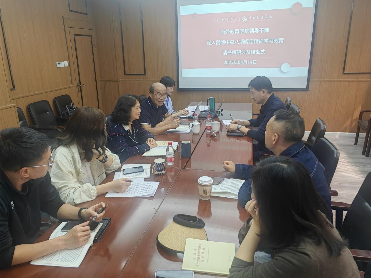 2025 年 4 月 14 日,2138CC太阳集团领导干部深入贯彻中央八项规定精神学习教育(以下简称 “学习教育”)读书班开展集中研讨并圆满结业。此次活动紧密围绕国际中文教育发展需求,聚焦高校教师学术诚信建设和教风、学风建设,致力于优化学院行政管理效能。学校学习教育工作专班代表、党委保卫处副处长杨丙军到会指导;海外教育学院书记高伟、副院长雷莉、专职组织员季春琳、学院支部委员、学生科科长等参加会议,高伟主持相关活动。