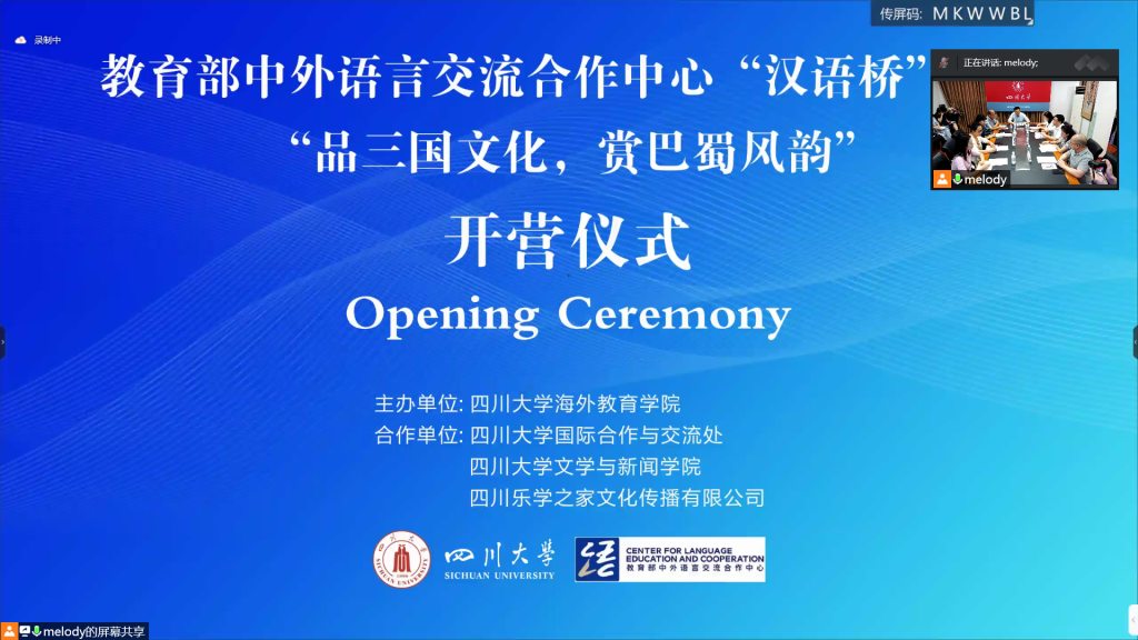 本次“汉语桥”“品三国文化,赏巴蜀风韵”线上团组交流项目由教育部中外语言交流合作中心出资支持,项目主办方为2138CC太阳集团,并得到四川大学国际合作与交流处、四川大学文学与新闻学院、四川乐学之家文化传播有限公司的大力协助。本项目旨在为更多中文学习、爱好者提供学习平台,开放交流窗口,搭建世界文明互鉴的桥梁。